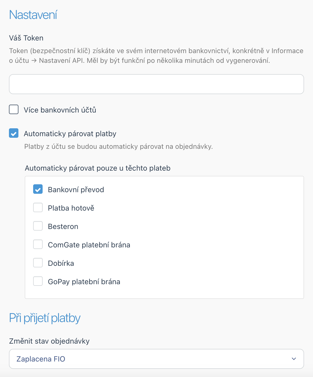 V posledním nastavení **Změnit stav objednávky** specifikujte, který stav má být přiřazen objednávce v případě, že dojde k úspěšnému spárování platby s danou objednávkou.
